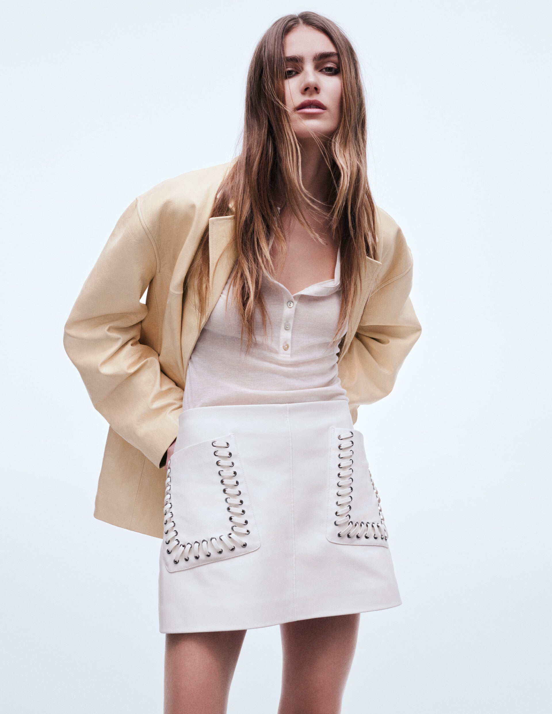Las prendas destacan por sus detalles y texturas únicas, como bordes decorativos en cuellos y puños, vestidos de crochet, minifaldas con trenzados o costuras especiales, y faldas plisadas con volantes en capas que se mueven con facilidad. Para equilibrar, hay piezas más estructuradas, como una chaqueta con tachas o de los años 70 con varios bolsillos, hechas en cuero.